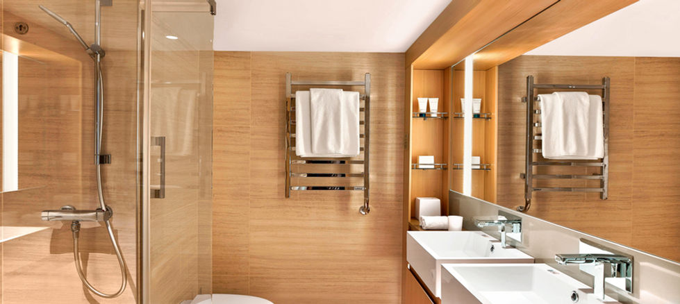 大型主浴室配寬敞玻璃淋浴間,雙洗手池,地熱系統與防霧鏡,兩間客用浴室