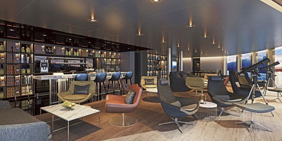 位於5樓船頭的探索俱樂部,提供180度絕佳的視野。舒適歐洲特製皮椅與腳凳,讓您的閱讀小憩時,還可以遠眺湛藍的深海浪潮。當夜幕低垂時,透過施瓦洛士奇的高倍數天文望遠鏡,您可以仰望星空,尋找星座的傳說。渴了,多重特殊風味的茶讓您潤喉,並且品茗它的氛香。若是海上跳出突然訪客,或是兩旁冰山飄過,您與近距離邂逅,只是推出一道門的距離。